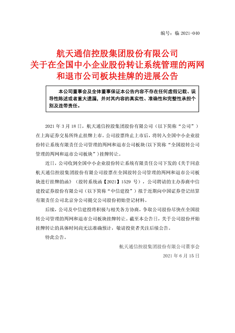 航天通信控股集團股份有限公司關(guān)于在全國中小企業(yè)股份轉(zhuǎn)讓系統(tǒng)管理的兩網(wǎng)和退市公司板塊掛牌的進展公告
